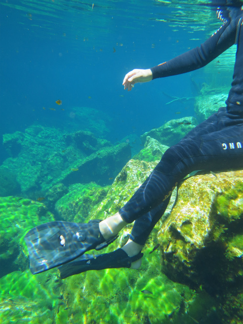 一方、私たちシュノーケルチームは、オープンウォーターエリアで気持ちよ〜くシュノーケル。朝一番で他に泳いでいる人がいなかったので、お腹ぺこぺこのドクターフィッシュの猛攻撃にあいました。