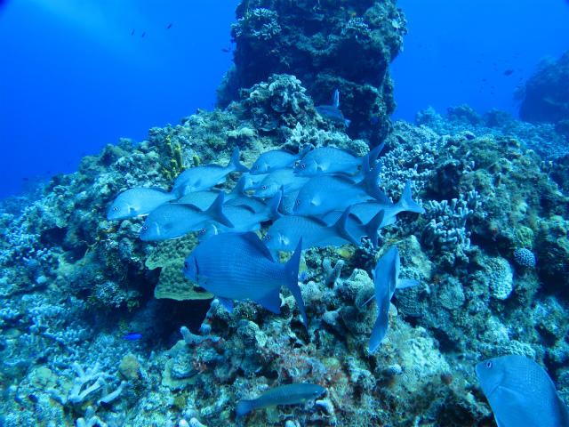 リーフの上のホワイトマーゲイト(イサキ科)の群れも透明度が良いのでとても綺麗です。