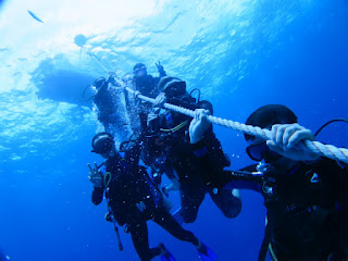 エントリー時は流れがそんなになかったので、予定したロープ潜降をやめてそのまま船に向かって降りて行きましたが、行きはヨイヨイ帰りは・・・みんなで鯉のぼり状態になりながらの安全停止。
