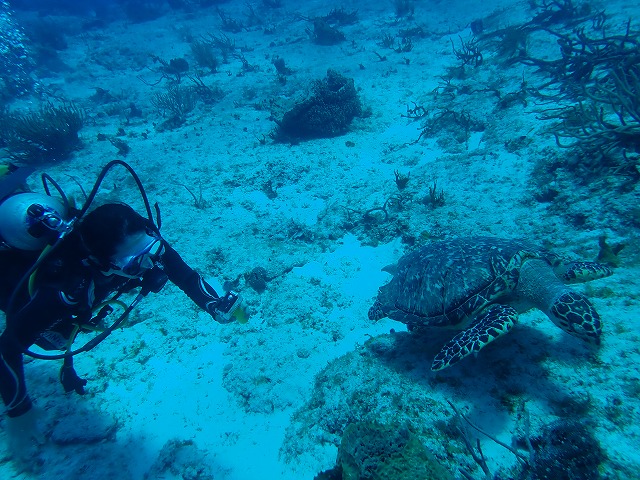 カメを見つけてアピールしていたんです。流れもありI様は近くに見ることができなかったのですがT様は体験ダイビングと思えないほどの猛ダッシュ。