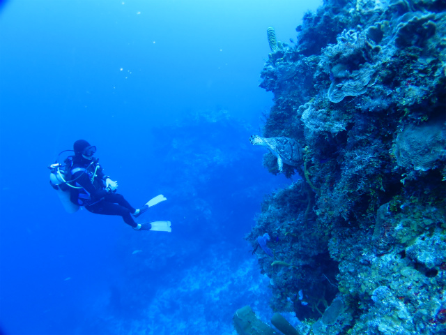 海綿の中にものすごく頭を突っ込んで食餌中のカメを見ていたら、トードフィッシュの鳴き声!え???ここで???と思い、かなり周りを探しましたが発見に至らず。遠く日本で冬眠中の佐々木がコスメル潜りたいよ〜と言っているのがトードフィッシュに乗り移って一瞬鳴いたのかもしれません。